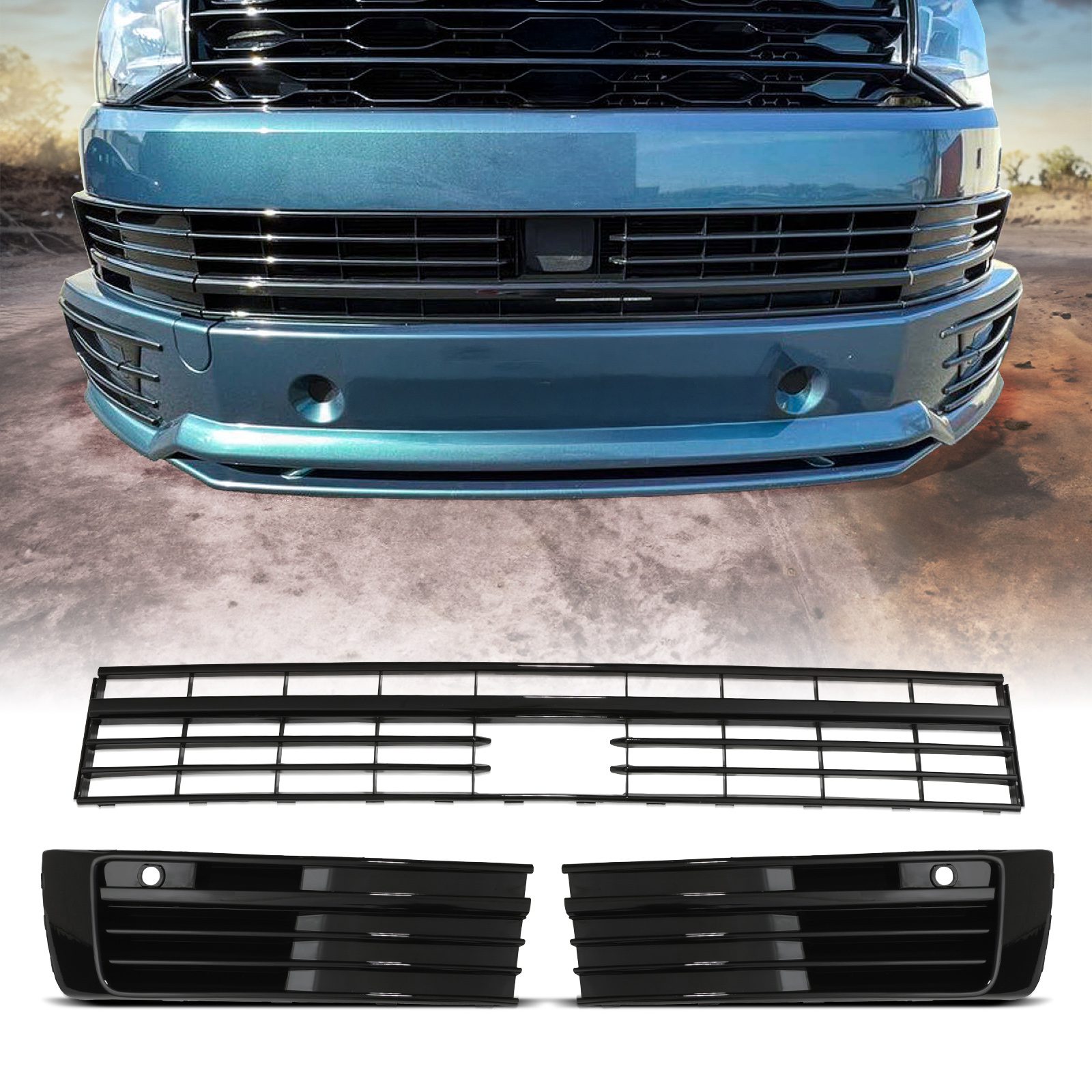 VW Transporter T6 16-19 Gloss Black Lower Grille Trim Set For Models With Radar & Parking Sensors
