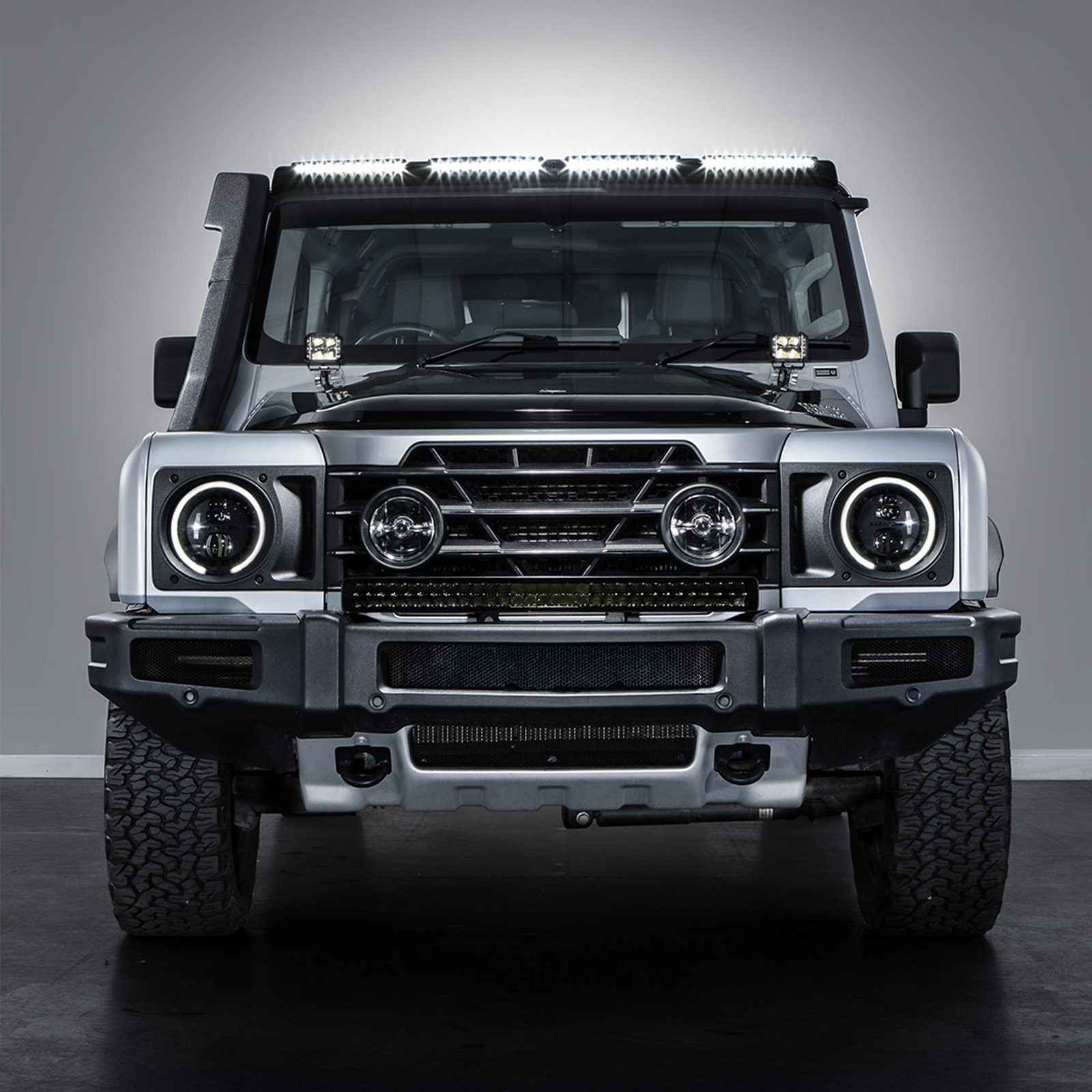 Introducing Rogue4x4’s brand new Quad LED Roof light for the Ineos Grenadier. Offering industry leading performance thanks to four powerful 6″ LED lights- producing a total of 10,080 lumens- strategically positioned for maximum coverage. Our Quad LED Roof Light floods your surroundings with brilliant bright light, ensuring unparalleled visibility in even the most challenging conditions.